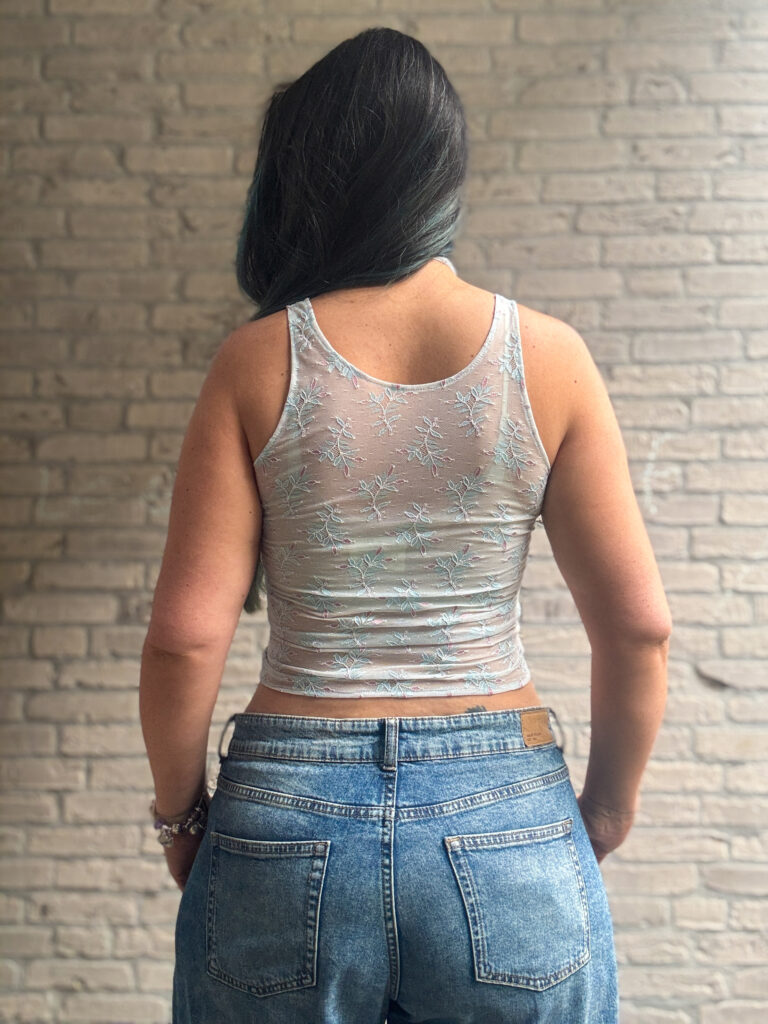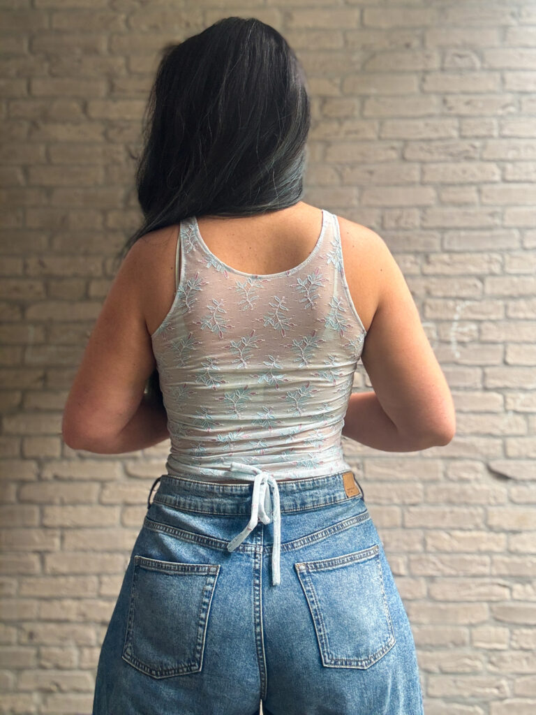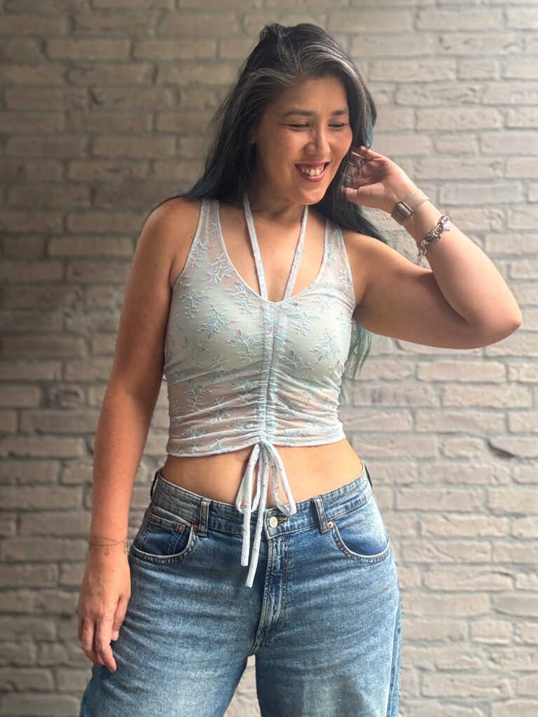 I had this soft blue stretch lace, and Iโm honestly obsessed with how it turned out. It gives off a Y2K softness without going full throwback… like low-key nostalgia. ๐