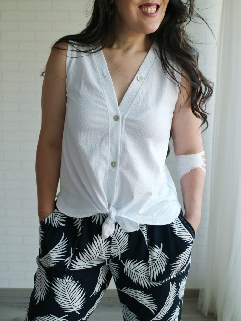 It also has a large array of possibilities when it comes to fabric choices as it only needs 20% of stretch horizontally and 10% vertically. So it can be a lightweith breazy tank for summer or a nice and cozy cardi for fall.
