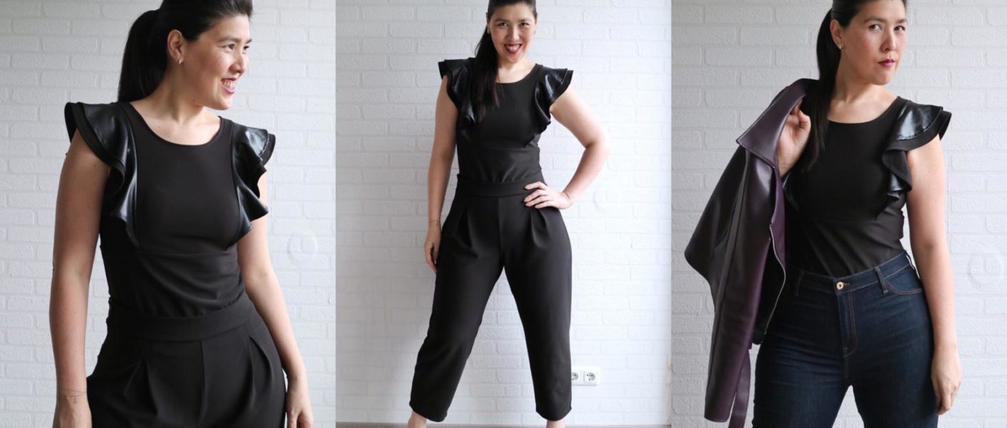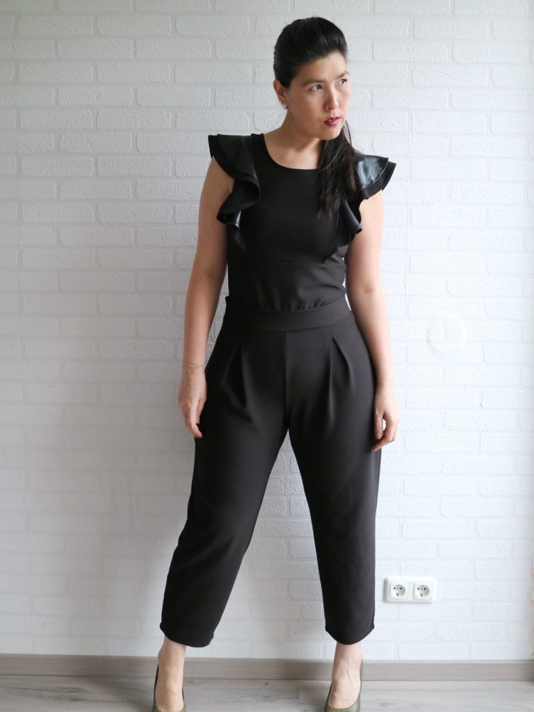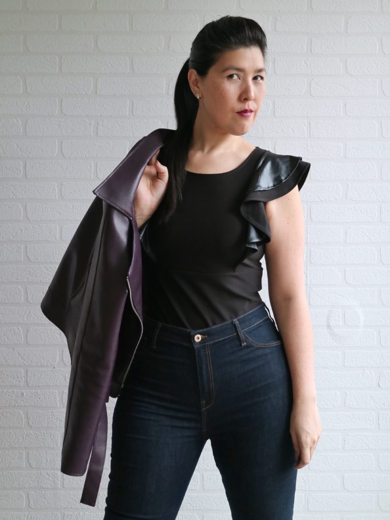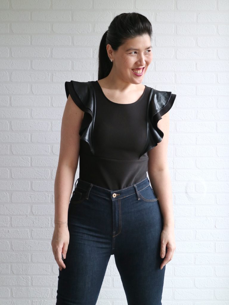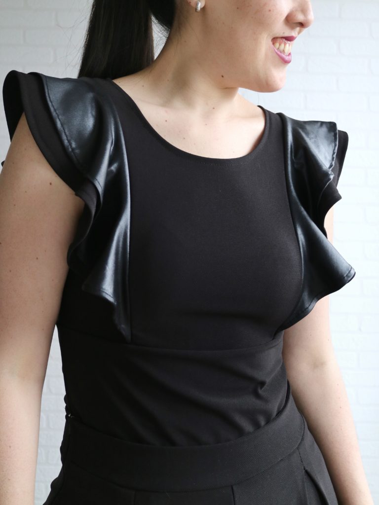 I used Pleather for the smaller top ruffle and Scuba Twill for all the rest. I love the added drama the sturdiness of the scuba gave the ruffles!