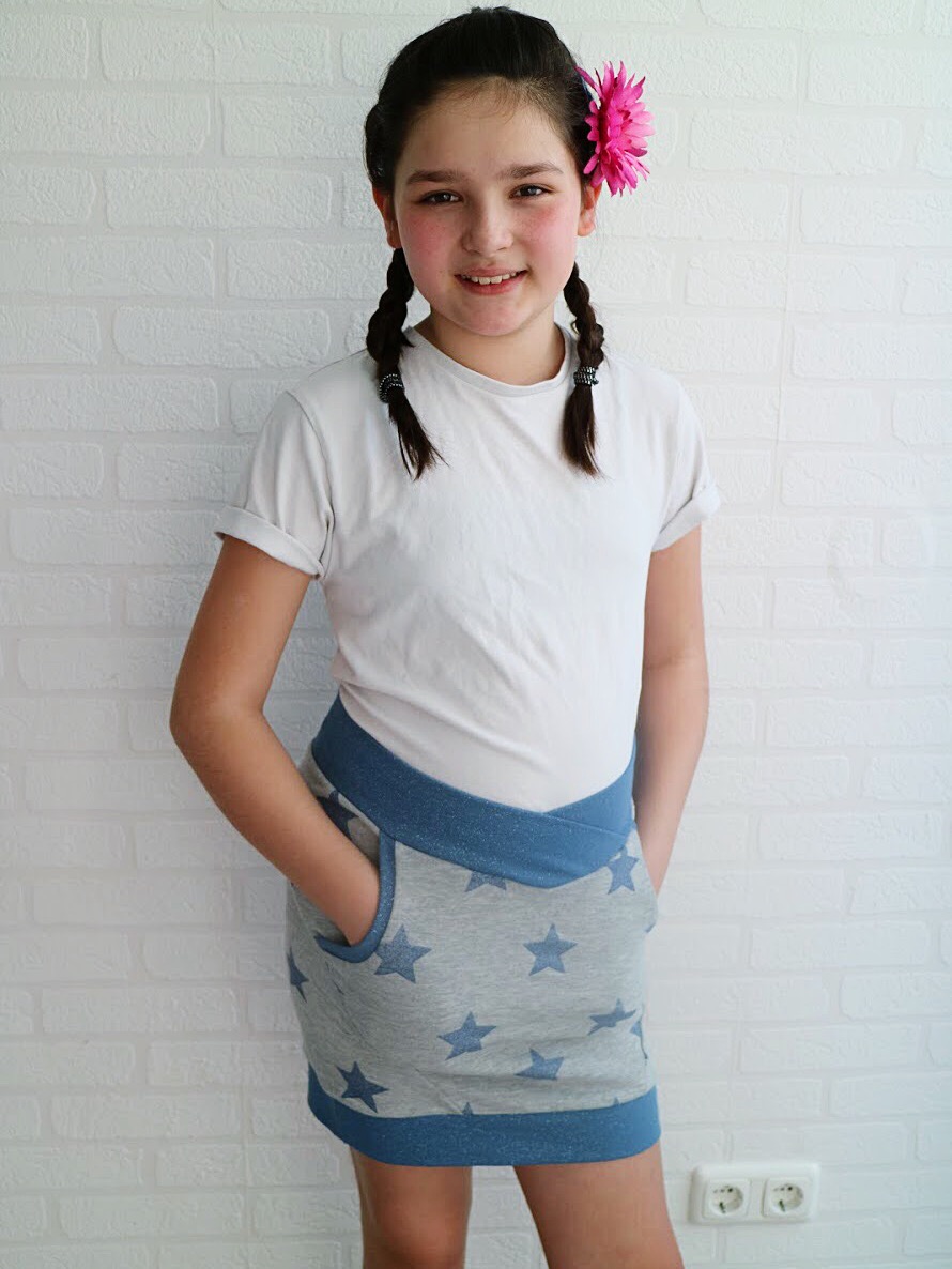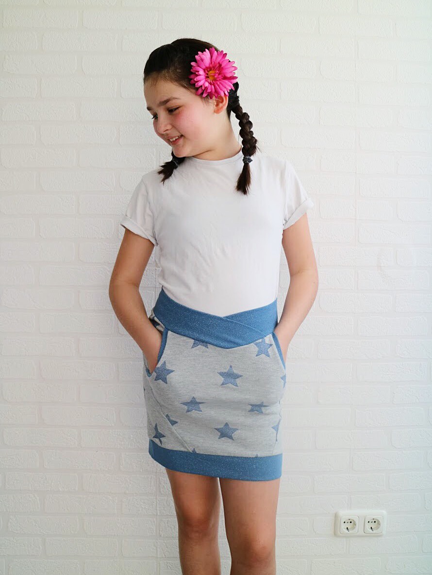 This skirt is made with sweatshirt fabric and pocket is punta. Worked out like a dream and she loves it! The skirt is long enough to wear it as is, but on a regular daily life, she’ll probably pair it with leggings. 🙂