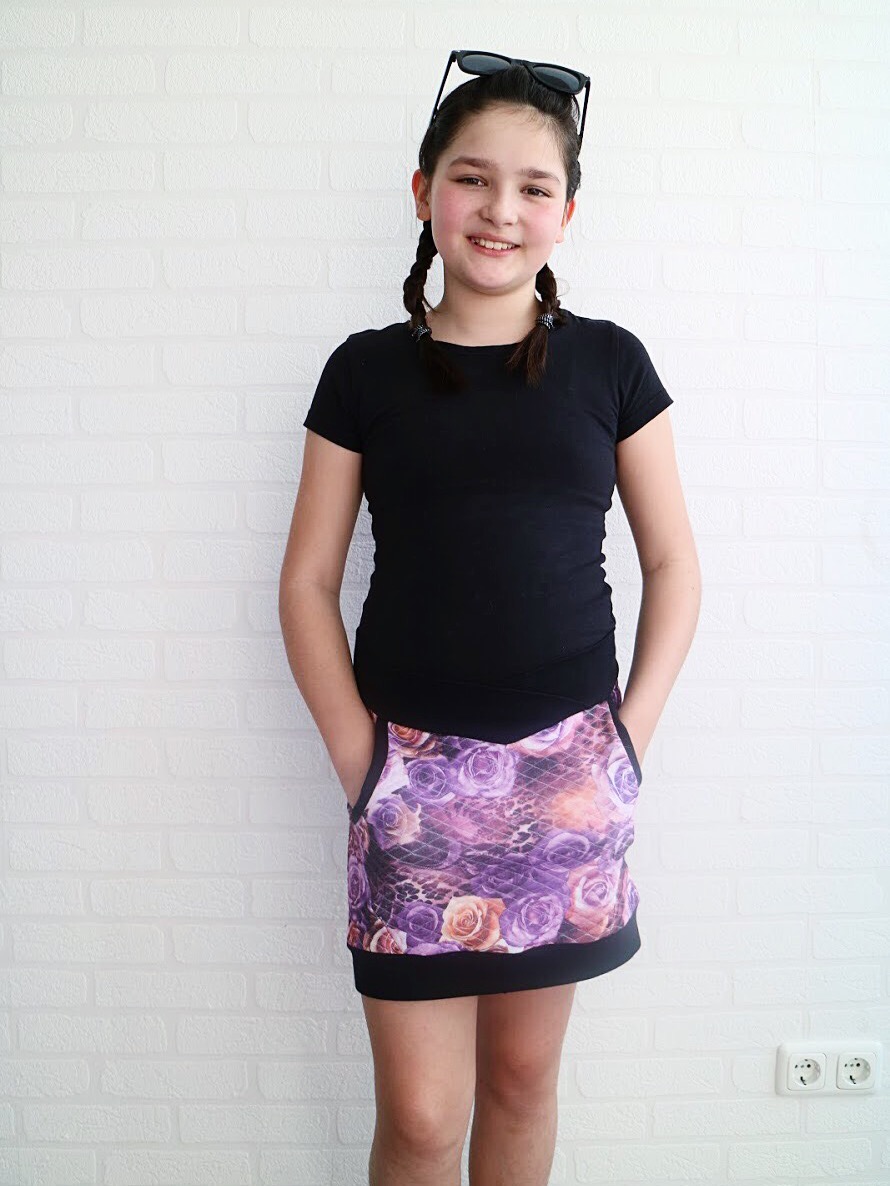 This skirt is made with sweatshirt fabric and pocket is punta. Worked out like a dream and she loves it! The skirt is long enough to wear it as is, but on a regular daily life, she’ll probably pair it with leggings. 🙂