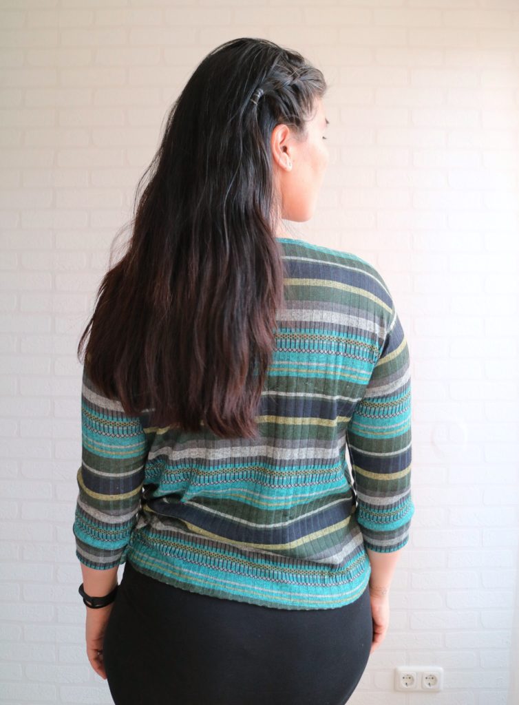 I’m not likely to wear it as a crop top without a cami, dress or high waisted bottom with it, but wanted to illustrate the length and look as is. But who knows? This sweater knit is lightweight enough to be worn during the summer days… 😉