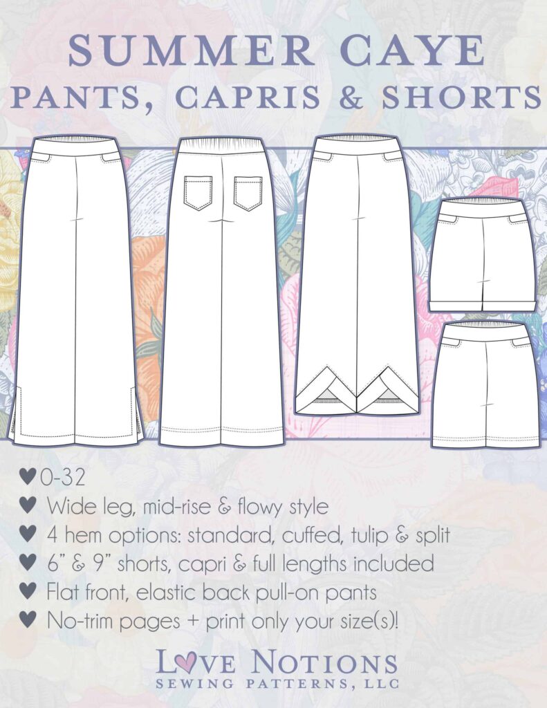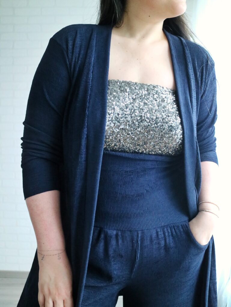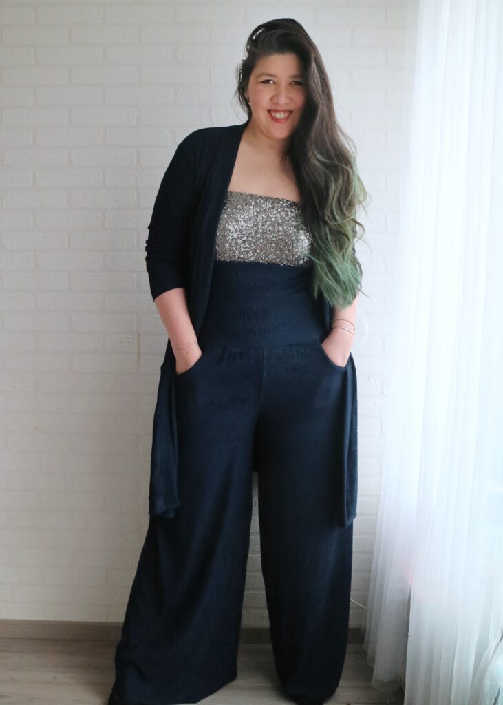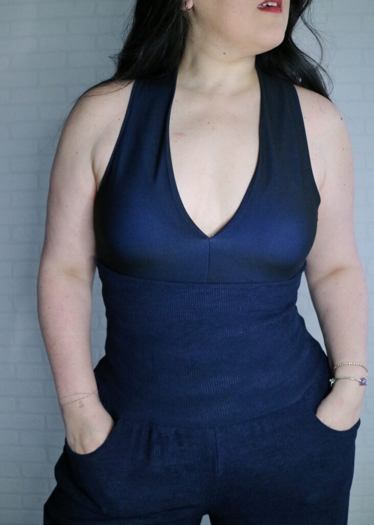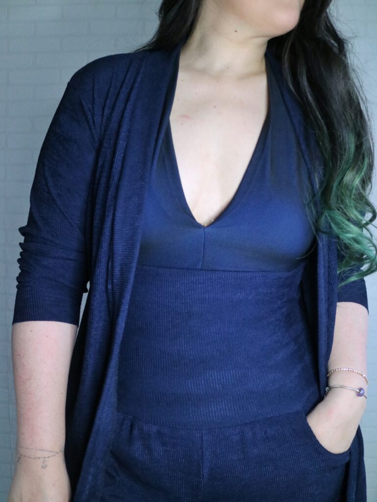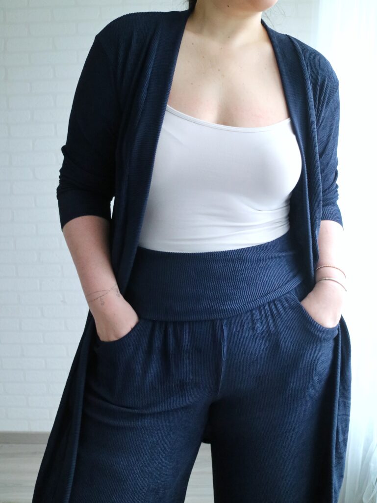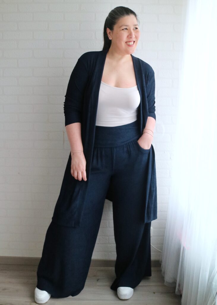 For the Summer Caye I just made the pants as per pattern (palazzo, standard hem, no side split) and added a simple yoga waistband. What may be a bit of a deviation from the norm is that I made the waistband super tall. It’s about 6″ when folded down and it goes all the way to underboob region when unfolded lol.