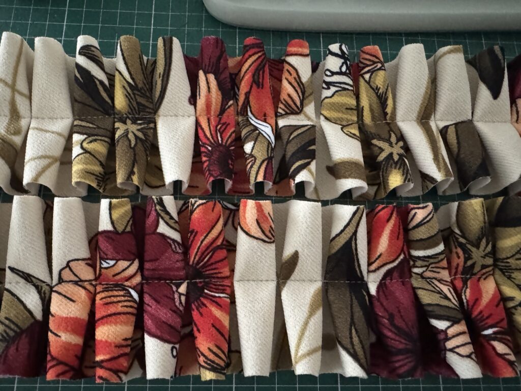 I marked the folds with an erasable pen, then sewed one fold up, one fold down, right down the center to lock them in place. After shaping the ruffle how I wanted, I added a strap and originally planned to attach it directly to the sweetheart neckline—but why commit when you can have options? A little sew-in snap keeps it secure but totally removable.