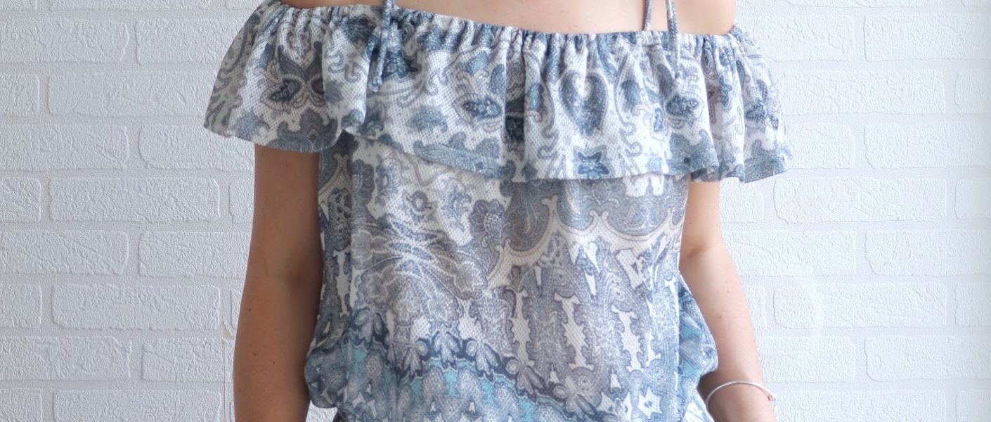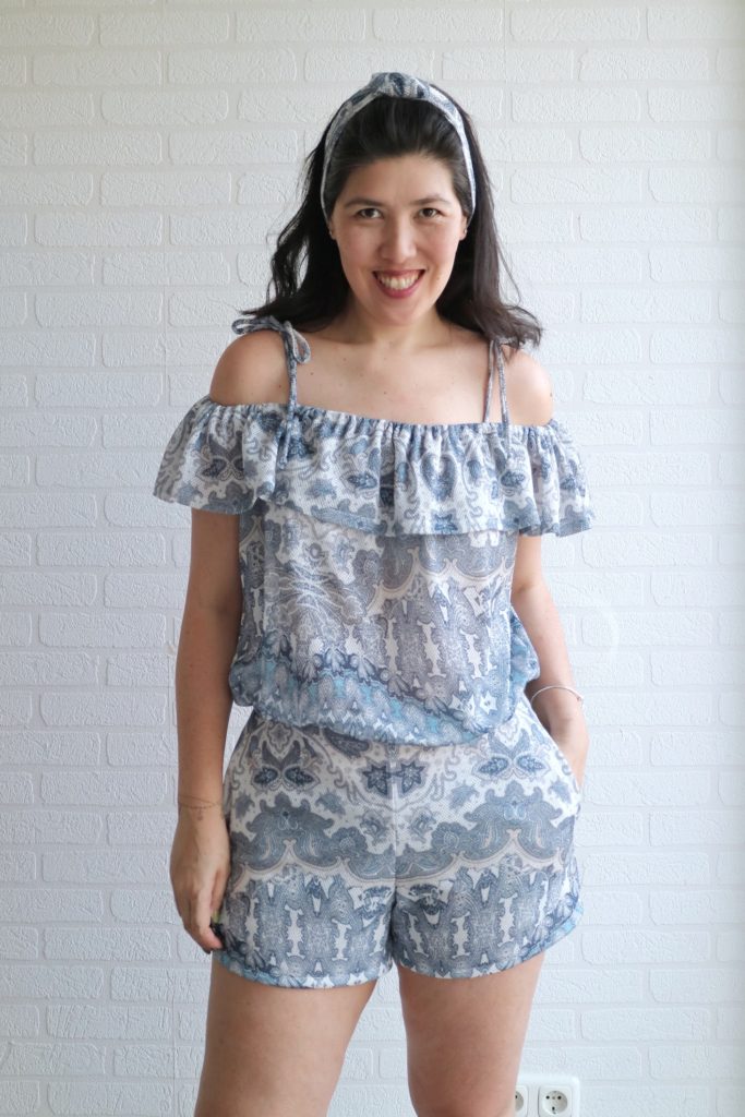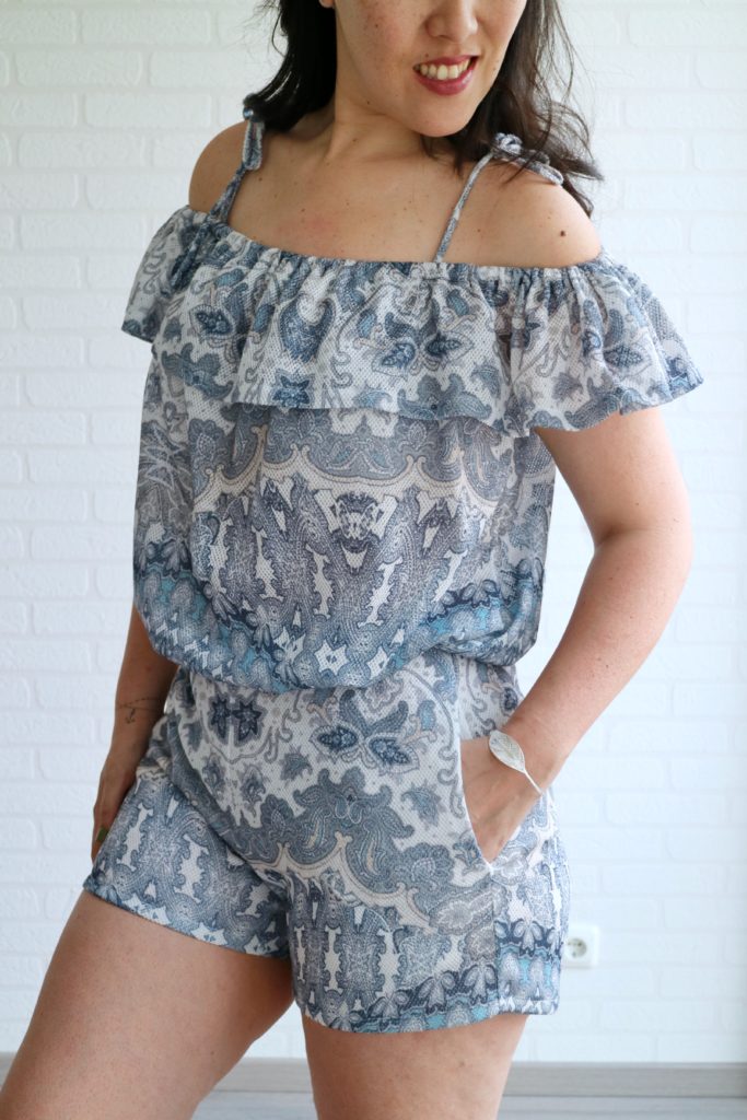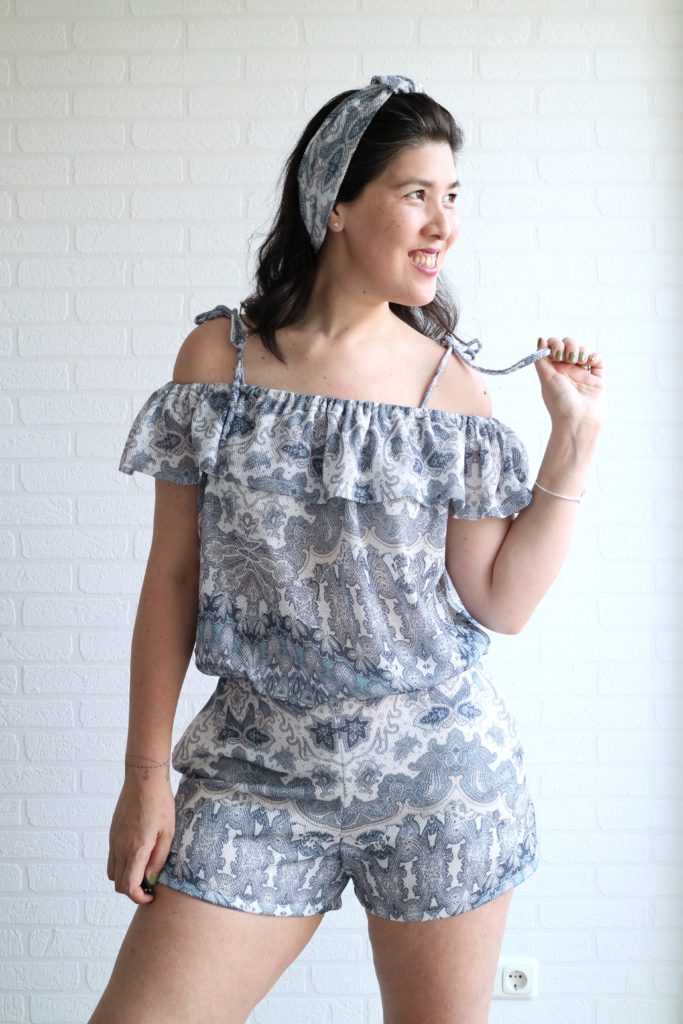 Off the shoulder with a flounce, the Jill has optional shoulder ties and pockets. It comes with three different lengths to choose from: Shorts, Knee and, Long pants. But honestly, the length is super easy adjustable and you can pretty much play with it and choose whatever length floats your boat! 😉
