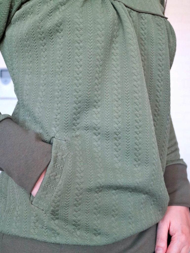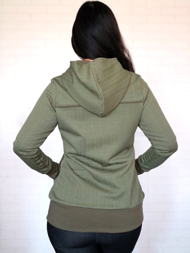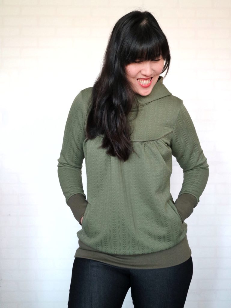 The fabric I used is Liverpool with a cabled knit pattern with a thick CL as bands and hood lining.