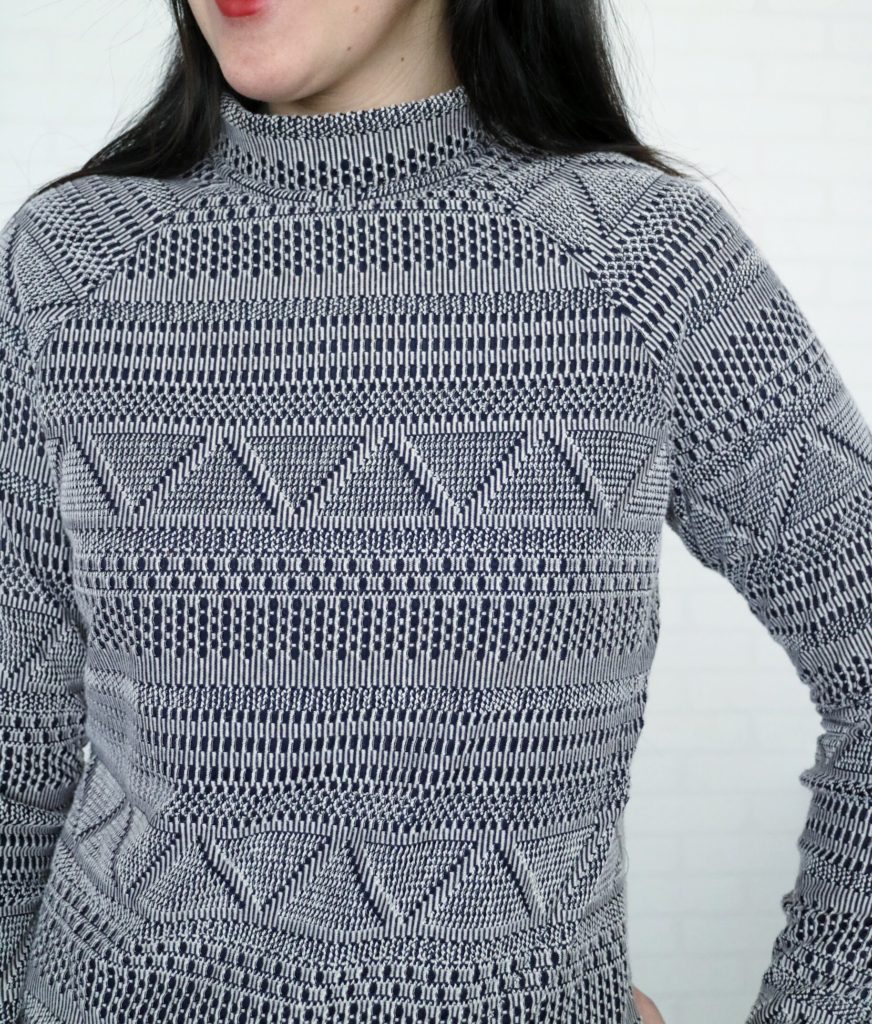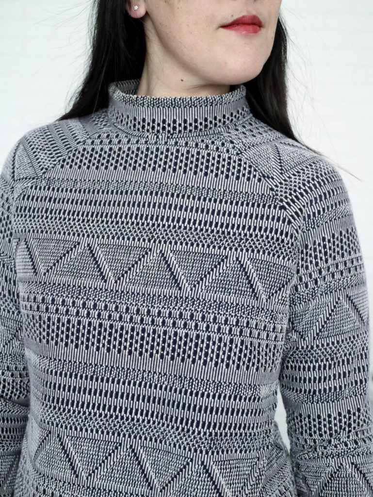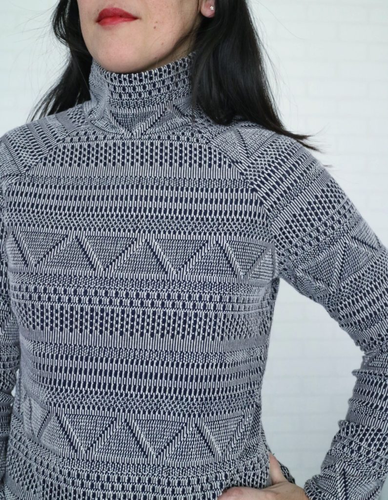The fabric I used is a double knit (open weave + lining) and it was a perfect choice for the pattern. It has about 15% horizontal stretch.
