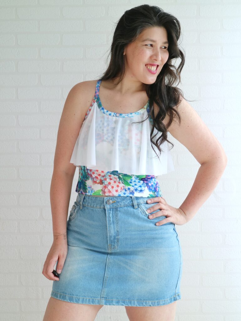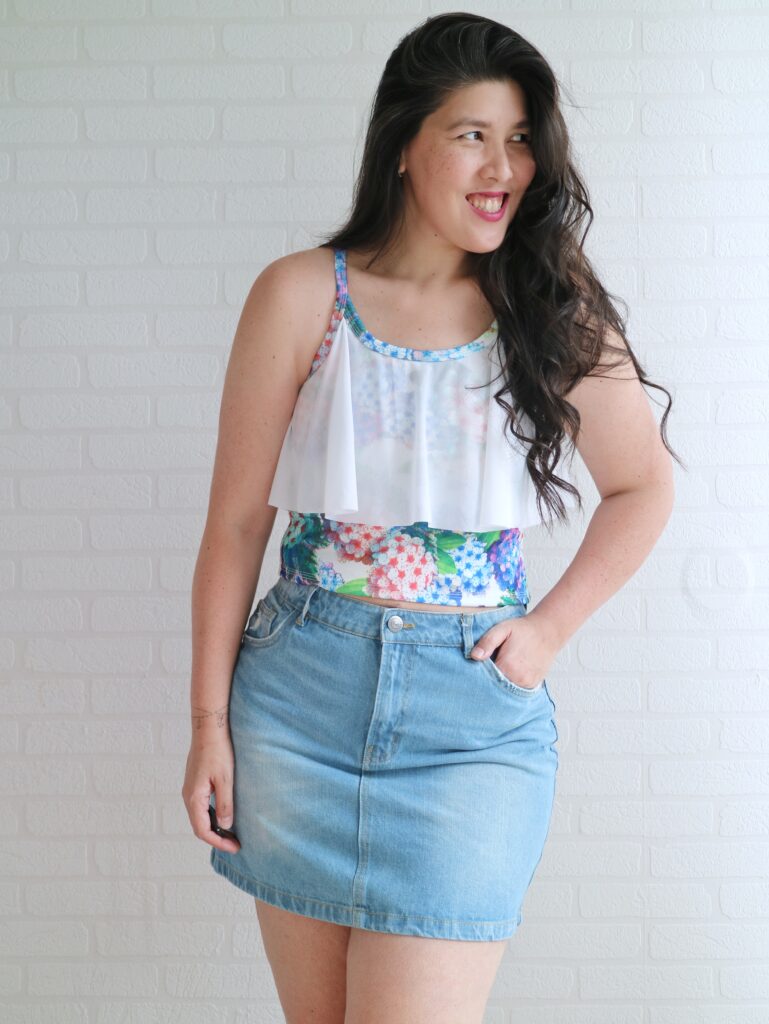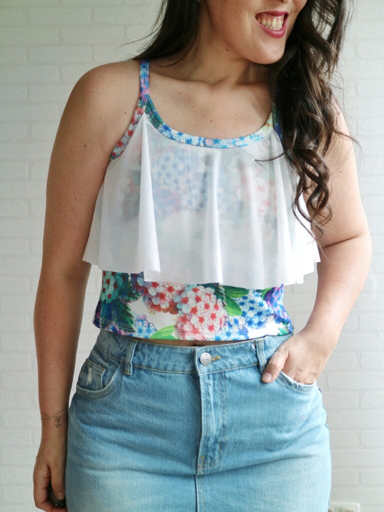 This time a crop top with a flounce both on front and back. Omg… how cute is this?