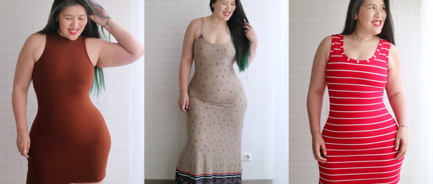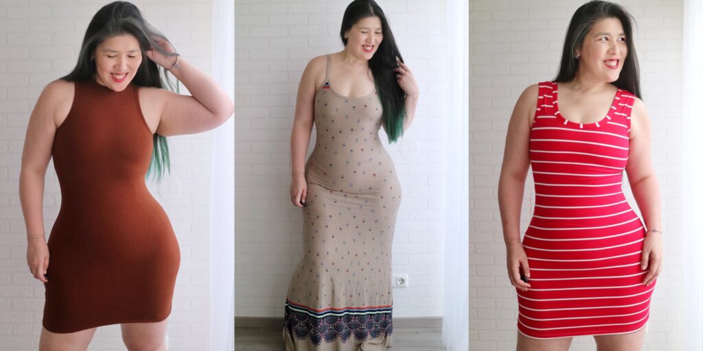 Both dresses are very very comfortable to wear, but the one on the left offers more compression/shaping, so keep fabric types in mind in order to achieve your preferred fit/look.