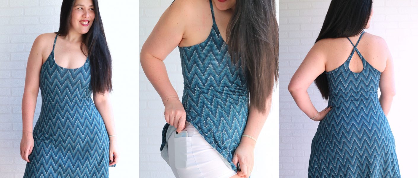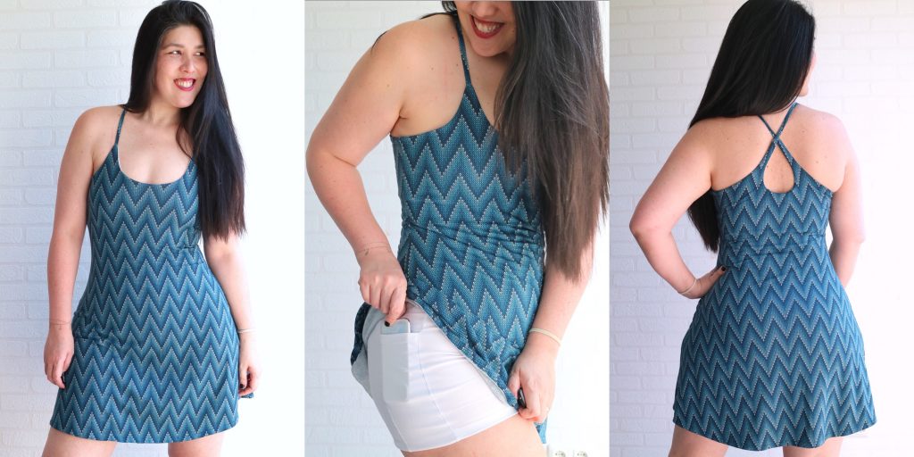 The pattern features a mini length dress with an attached playsuit underneath and a cute crossover eyelet strap on the back.