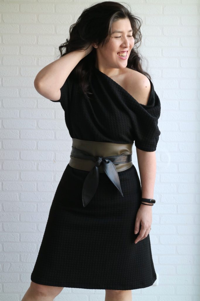 It’s off-shoulder, loose but with a flattering silhouette, perfect length to be chic but not formal, accentuates the waist and not the hips, and the fabric is heavy enough to hide lumps and bumps. <3