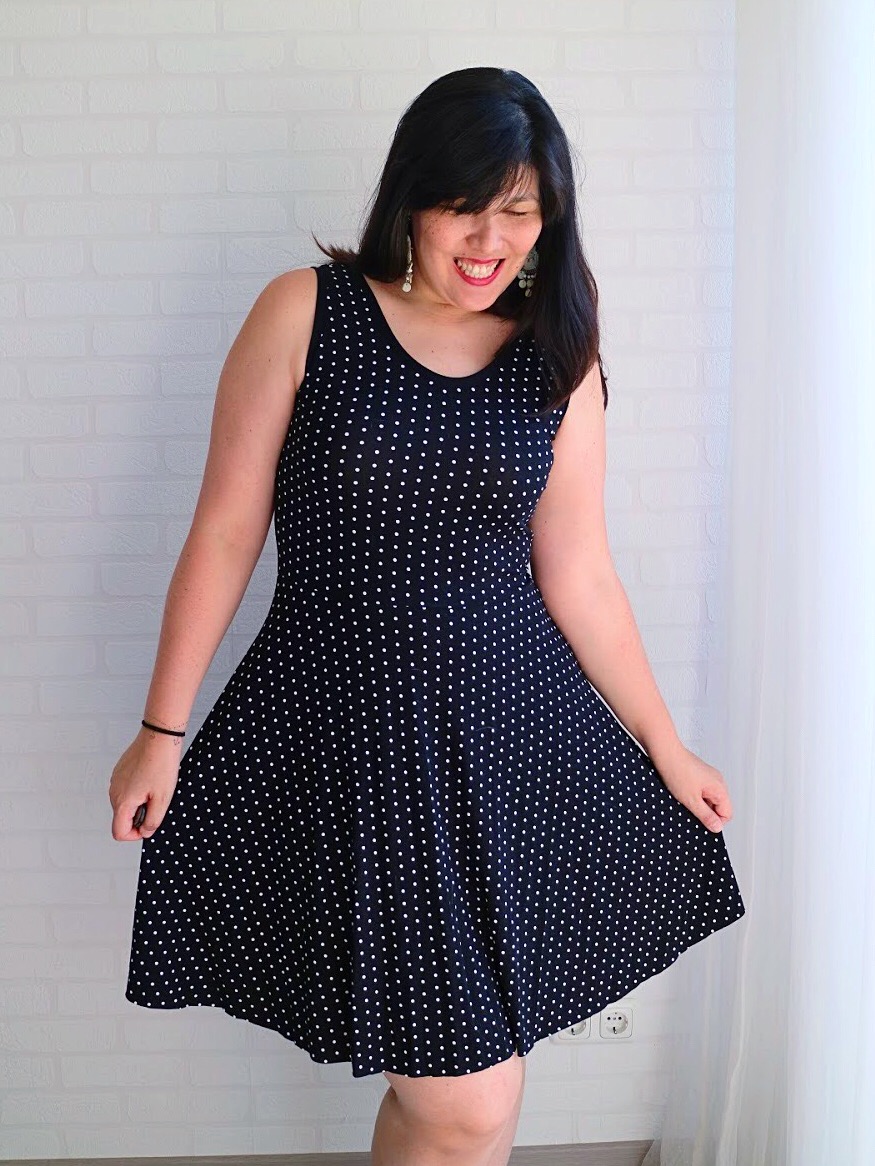 I opted for the regular waist and straight hem (normal waist option A) and used a rayon knit (viscose tricot). Black with white polka dots for a classic look.