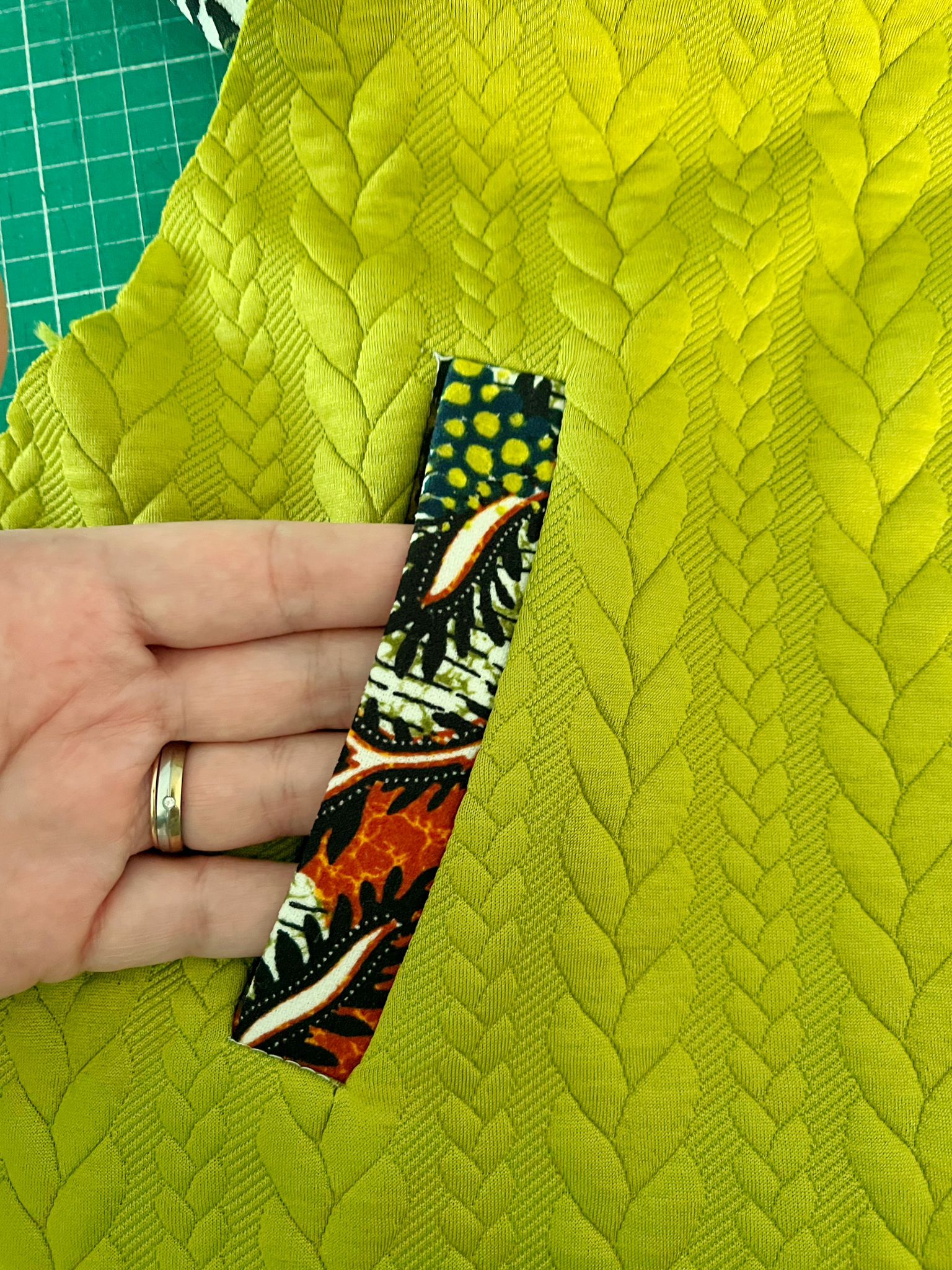 This pattern features welt pockets that can be added to the outside or the inside of the vest. For obvious reasons, the inside pockets will only work (aka be accessible) with the scoop armscye option.