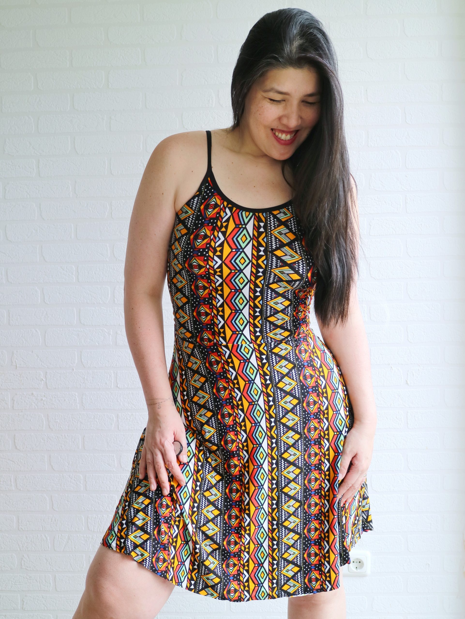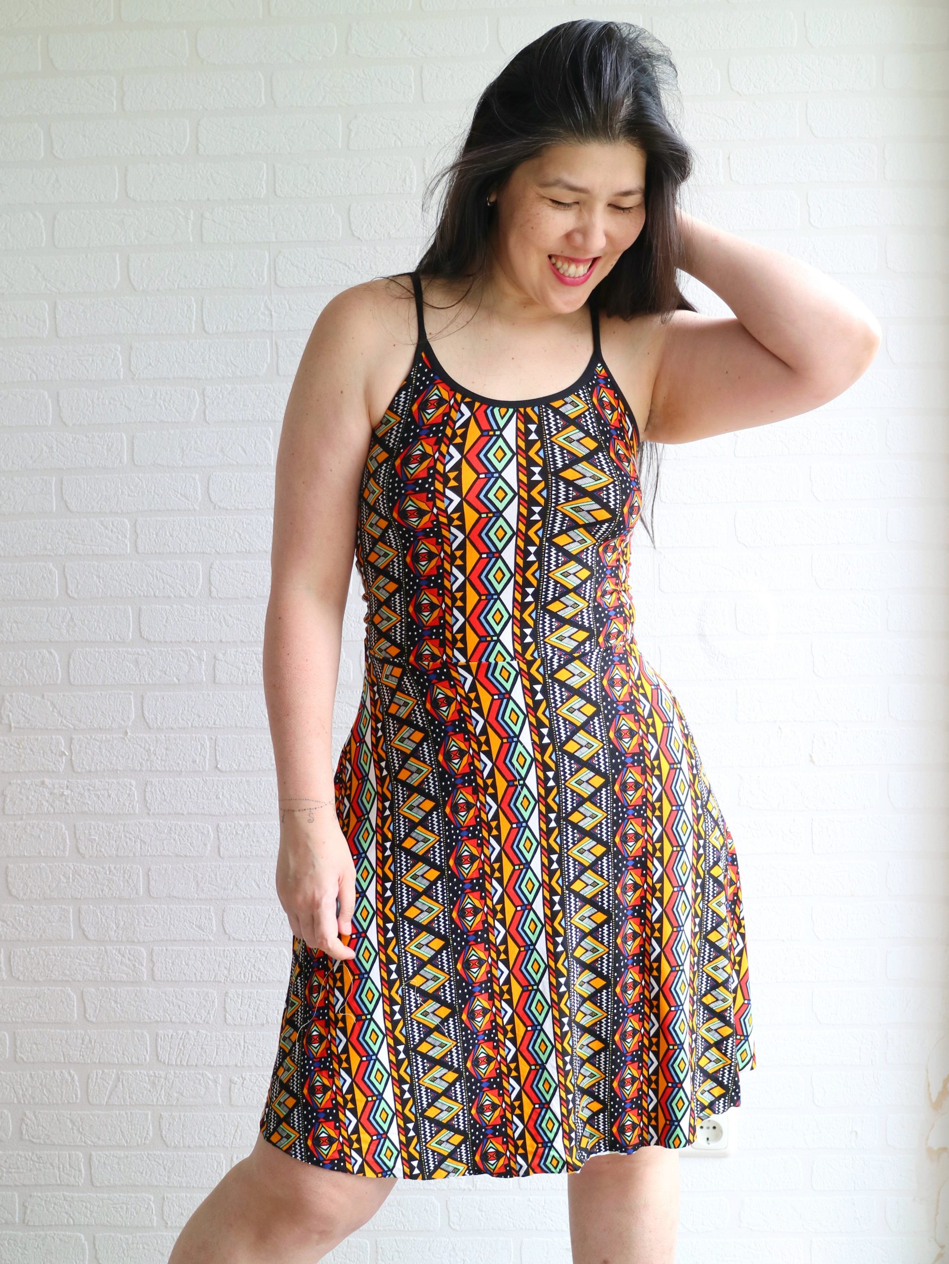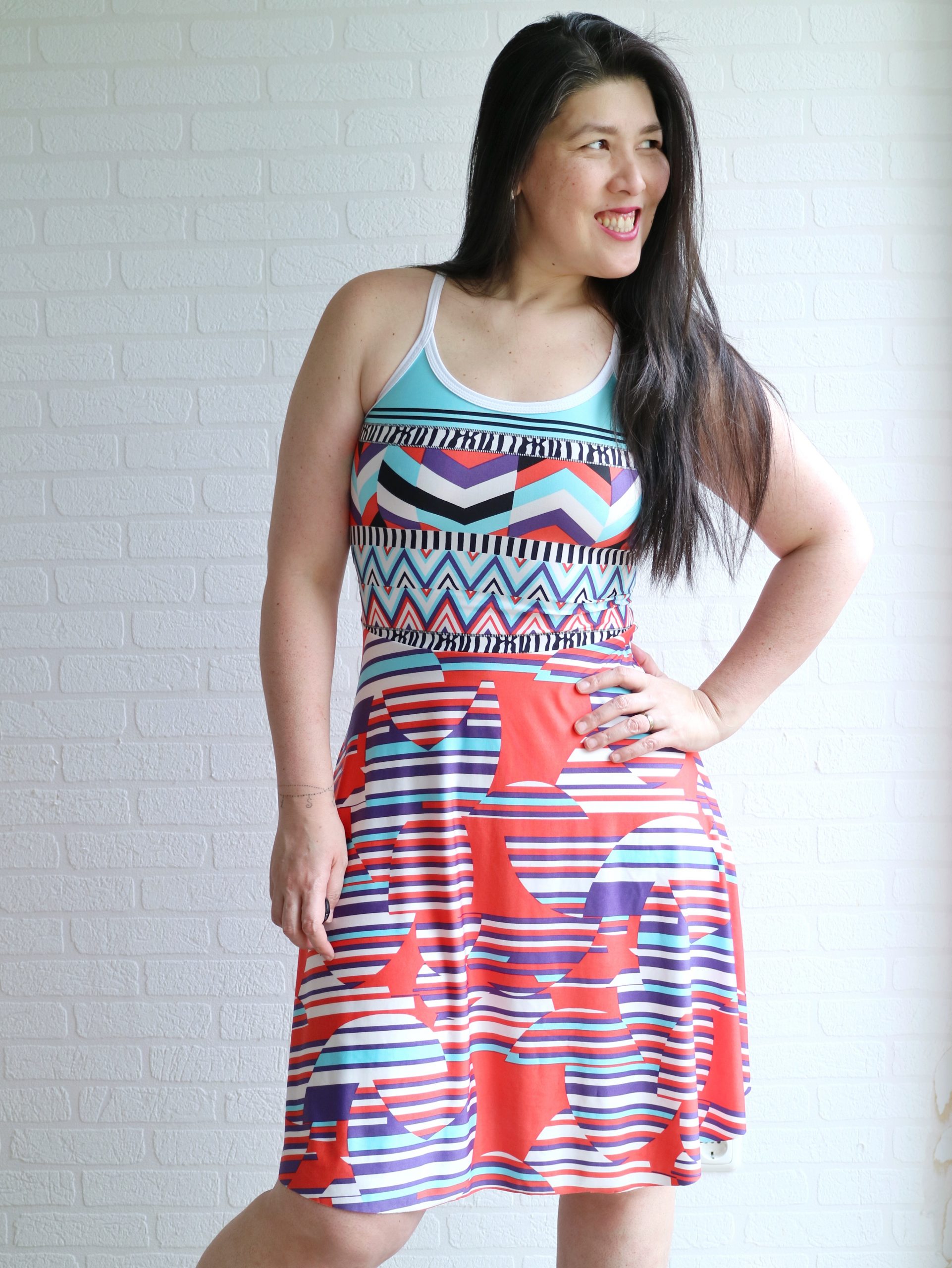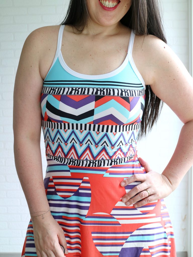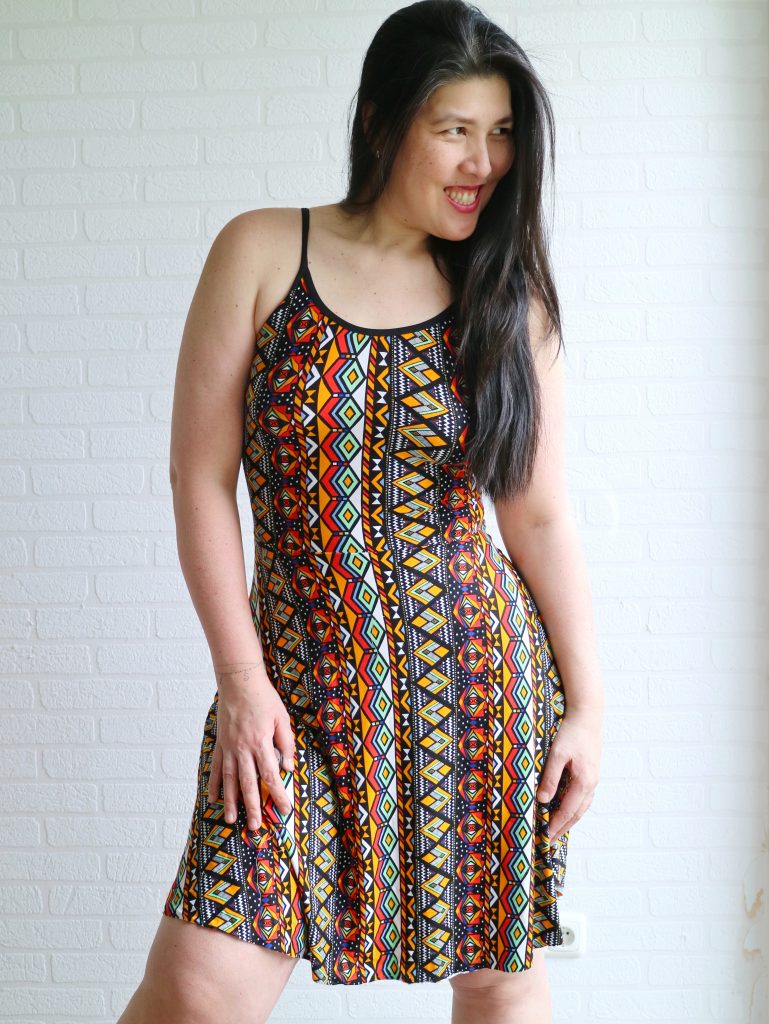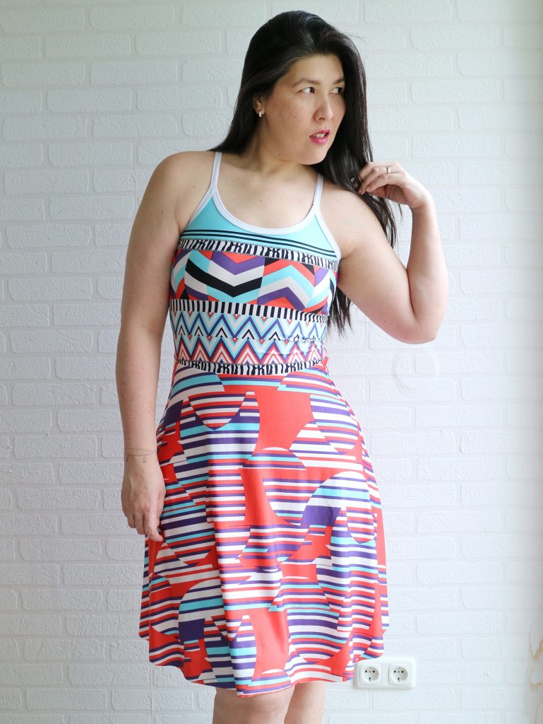 The fabric I used is a poly knit from Driessen. I kinda love the funky color mix and print.