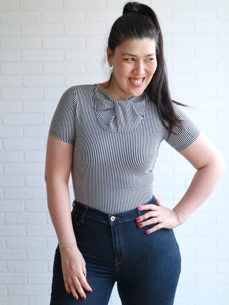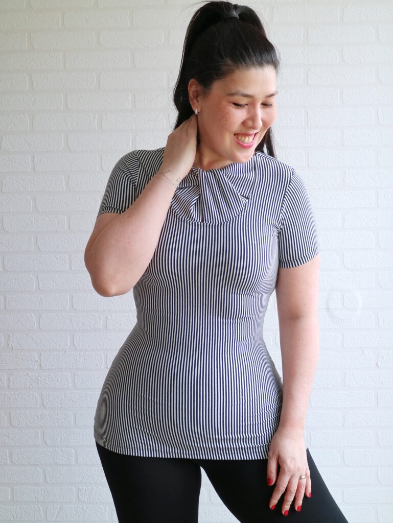 This striped one is a cotton jersey and a tiny bit snugger than the other tops because it doesn’t quite have the 50% stretch needed for the pattern. Well, it does… if used correctly. 😀 I turned the fabric 45 degrees so the striped ran vertically.