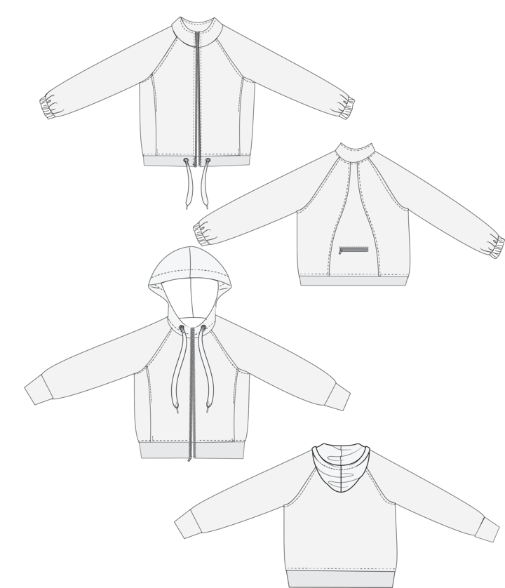 This jacket has so many possibilities and is drafted for low stretch fabrics!  It makes a great soft shell jacket for warmth or even a lightweight stretch woven for a light spring windbreaker.  It has an option for fun colorblocking in the back, princess seam side pockets and a zipper pocket in the back panel.